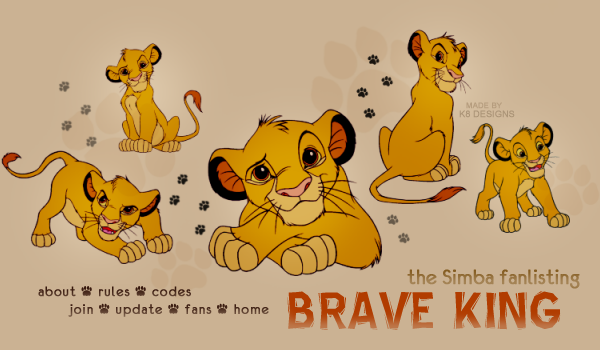 Welcome to "Brave King", a fanlisting devoted to the character from the Lion King, Simba. I hope you enjoy your visit and be sure to join the fanlisting if you are a fan. :)